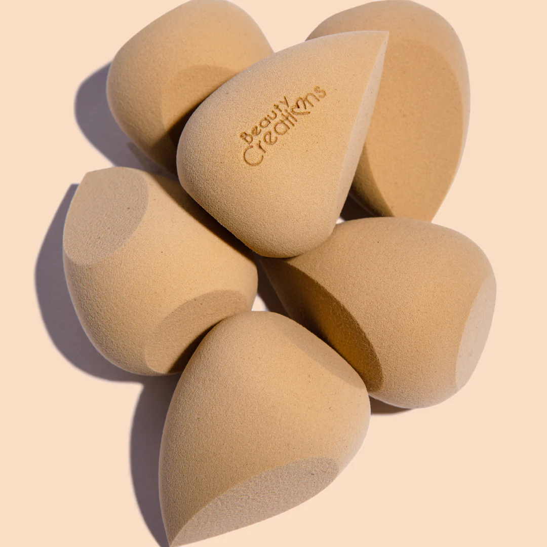 La esponja difuminadora tiene una base plana única con forma de lágrima y corte diagonal. Duplica su tamaño cuando está húmeda.